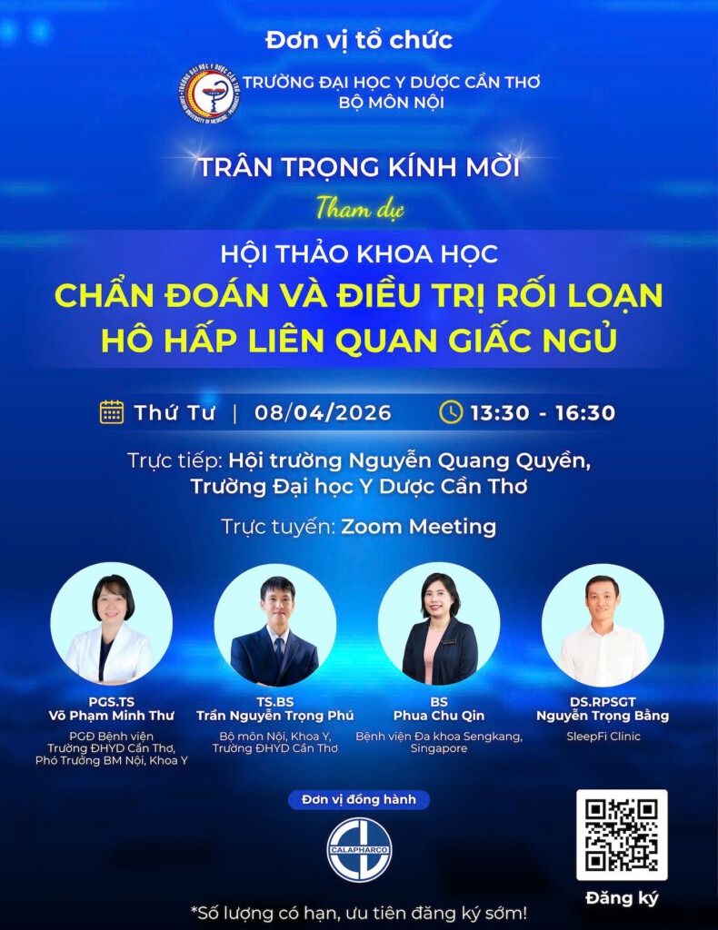 Calapharco hân hạnh đồng hành cùng Hội thảo khoa học do Bộ môn Nội – Trường Đại học Y Dược Cần Thơ tổ chức với chủ đề “Chẩn Đoán Và Điều Trị Rối Loạn Hô Hấp Liên Quan Giấc Ngủ”. Đây là chương trình chuyên môn quan trọng, hướng đến việc cập nhật toàn diện kiến thức về rối loạn hô hấp khi ngủ – một vấn đề ngày càng phổ biến và có ảnh hưởng sâu rộng đến sức khỏe cộng đồng.